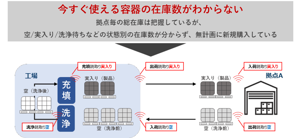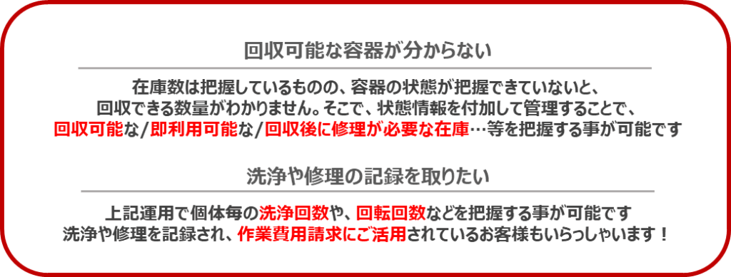 活用例vol.2 -容器の状態が分からない編- 2025年10月3日 最終更新日時 : 2025年10月3日 jpradmin Logiarxは、お客様の物流資産を個体管理するクラウドシステムです。第4号の今回は、管理課題の中から容器の状態を併せて管理する【ステータス管理】の活用例をお伝えします。 弊社では、全国でRFIDタグの読取りテストに対応しております!ご不明点がございましたら下記HPもしくはメールアドレスまでお気軽にお問い合わせください。