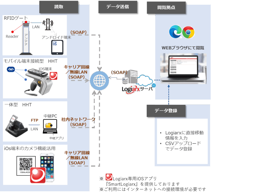 Logiarxは大きく分けて、読取り作業⇒データ送信⇒結果閲覧を実施いただく構成となっております。